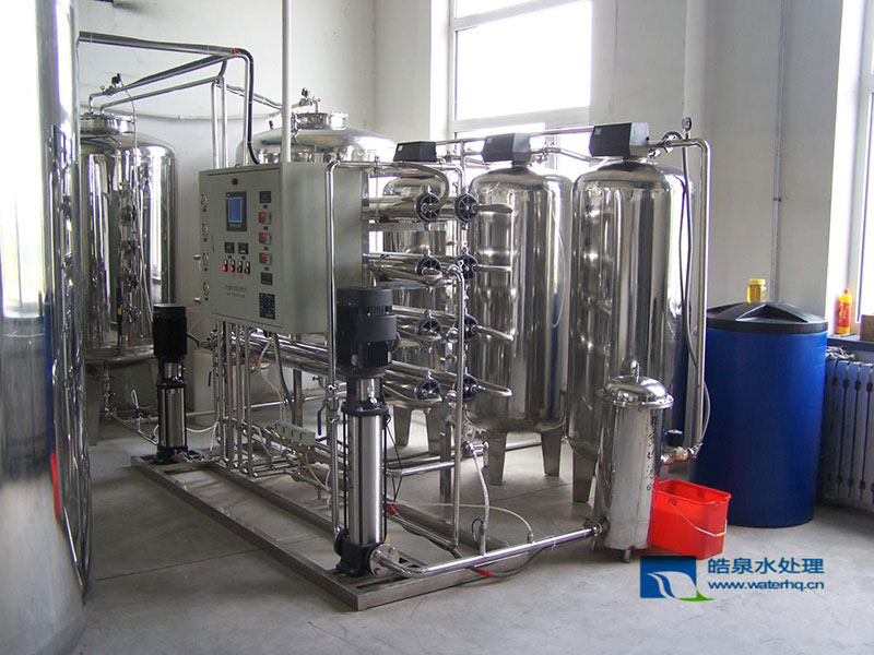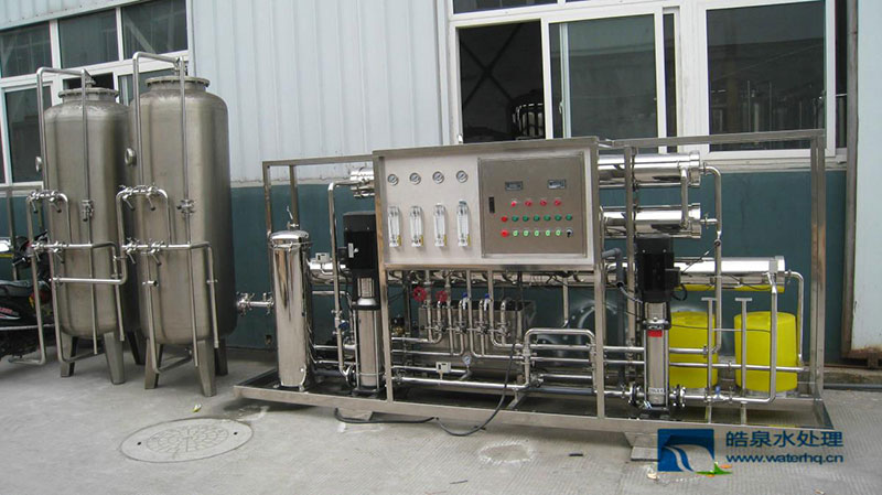 原水-原水加壓泵-多介質(zhì)過(guò)濾器-活性炭過(guò)濾器-軟水器(或阻垢加藥裝置)-精密過(guò)濾器-第一級(jí)反滲透-PH調(diào)節(jié)-中間水箱(可選)-第二級(jí)反滲透(反滲透膜表面帶正電荷)-純化水箱-純水泵-紫外線殺菌器-微孔過(guò)濾器-用水點(diǎn)