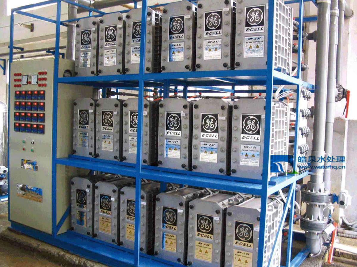 在位于模組兩端的陽(yáng)極(+)和陰極(-)之間加一直流電場(chǎng)。電勢(shì)就使交換到樹脂上的離子沿著樹脂粒的表面遷移并通過(guò)膜進(jìn)入濃水室。陽(yáng)極吸引負(fù)電離子(如OH,CI)這些離子通過(guò)陰離子膜進(jìn)入相臨的濃水流卻被陽(yáng)離子選擇膜阻隔,從而留在濃水流中。陰極吸引純水流中的陽(yáng)離子(如H,Na)。這些離子穿過(guò)陽(yáng)離子選擇膜,進(jìn)入相臨的濃水流卻被陰離子膜陰隔,從而留在濃水流中。當(dāng)水流過(guò)這兩種平行的室時(shí),離子在純水室被除去并在相臨的濃水流中聚積,然后由濃水流將其從模組中帶走。在純水及濃水中離子交換樹脂的使用是ElectropupreEDI技術(shù)和專利的關(guān)鍵。一個(gè)重要的現(xiàn)象在純水室的離子交換樹脂中發(fā)生。在電勢(shì)差高的局部區(qū)域,電化學(xué)反應(yīng)分解的水產(chǎn)生大量的H和OH。在混床離子交換樹脂中局部H和OH的產(chǎn)生使樹脂和膜不需要添加化學(xué)藥品就可以持續(xù)再生。